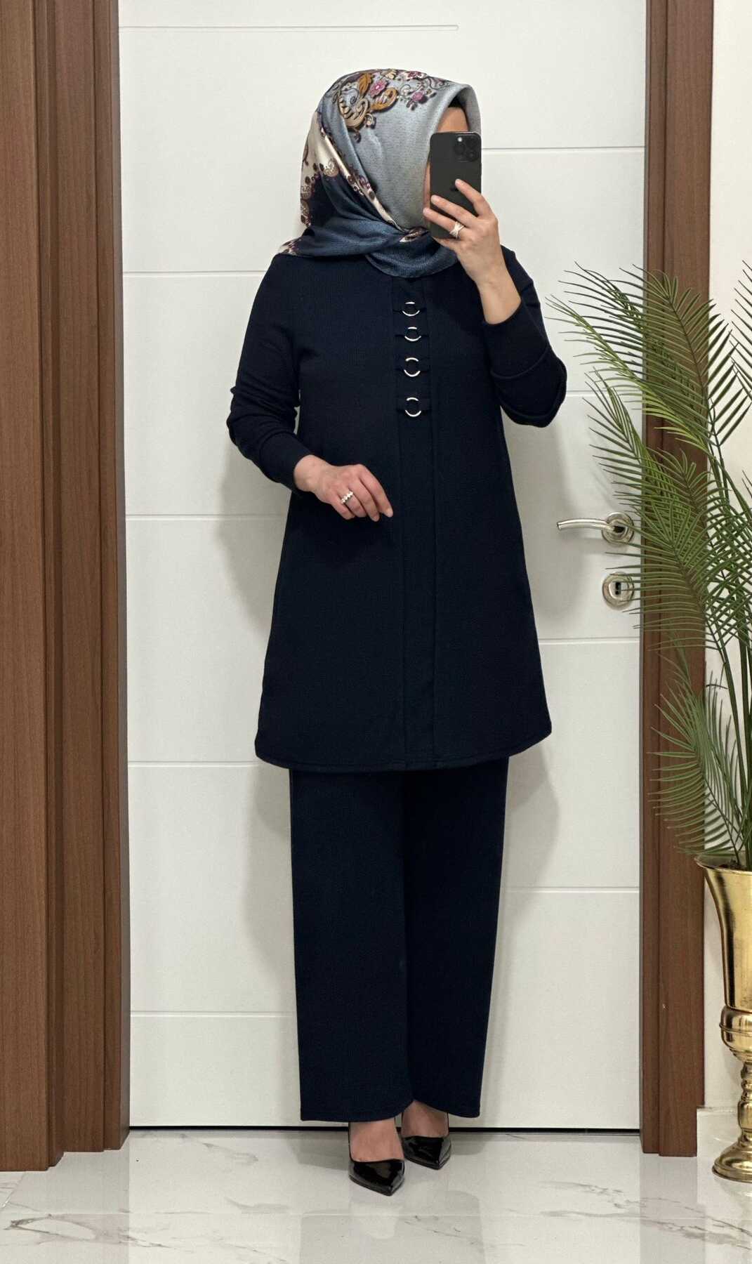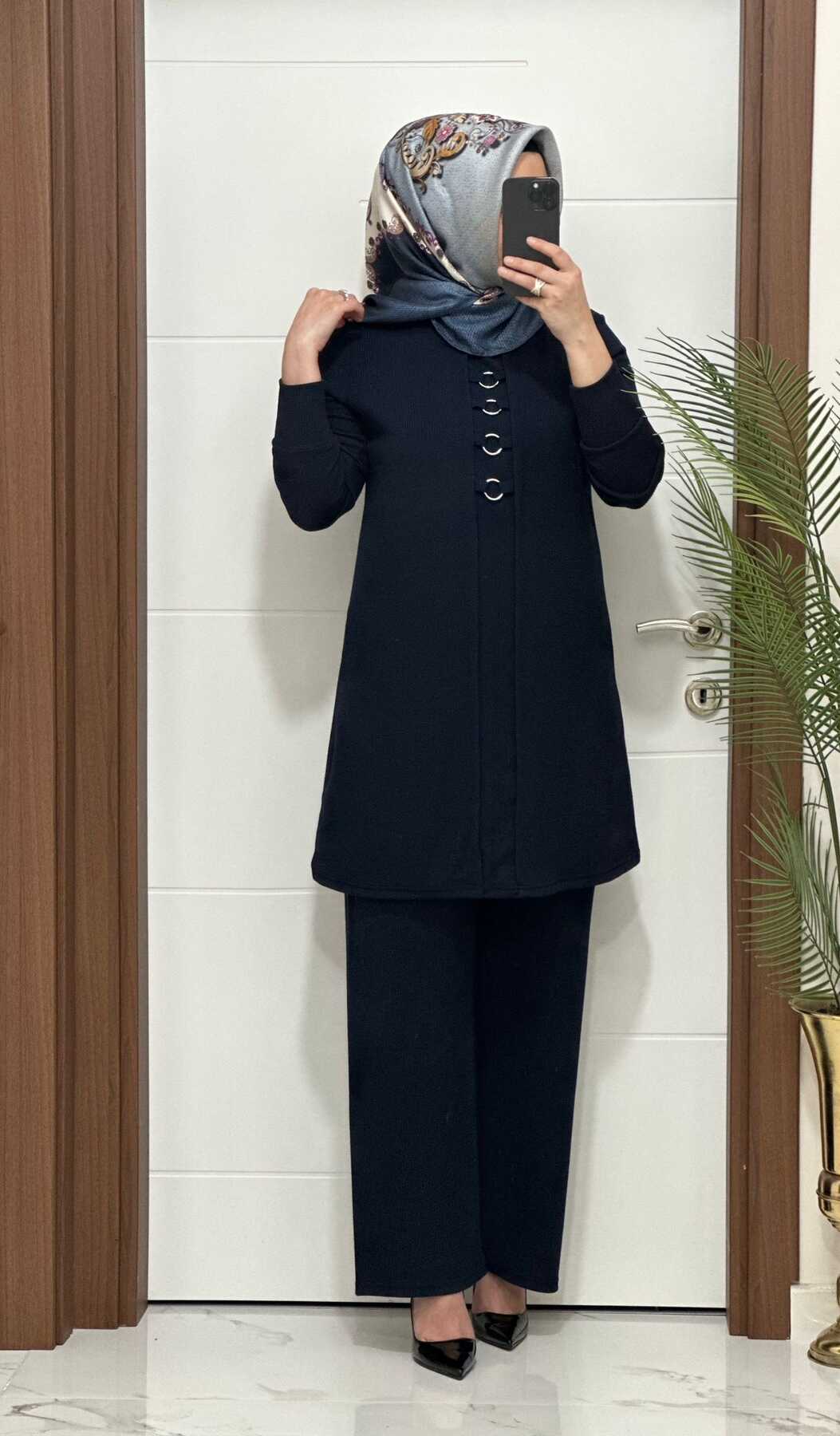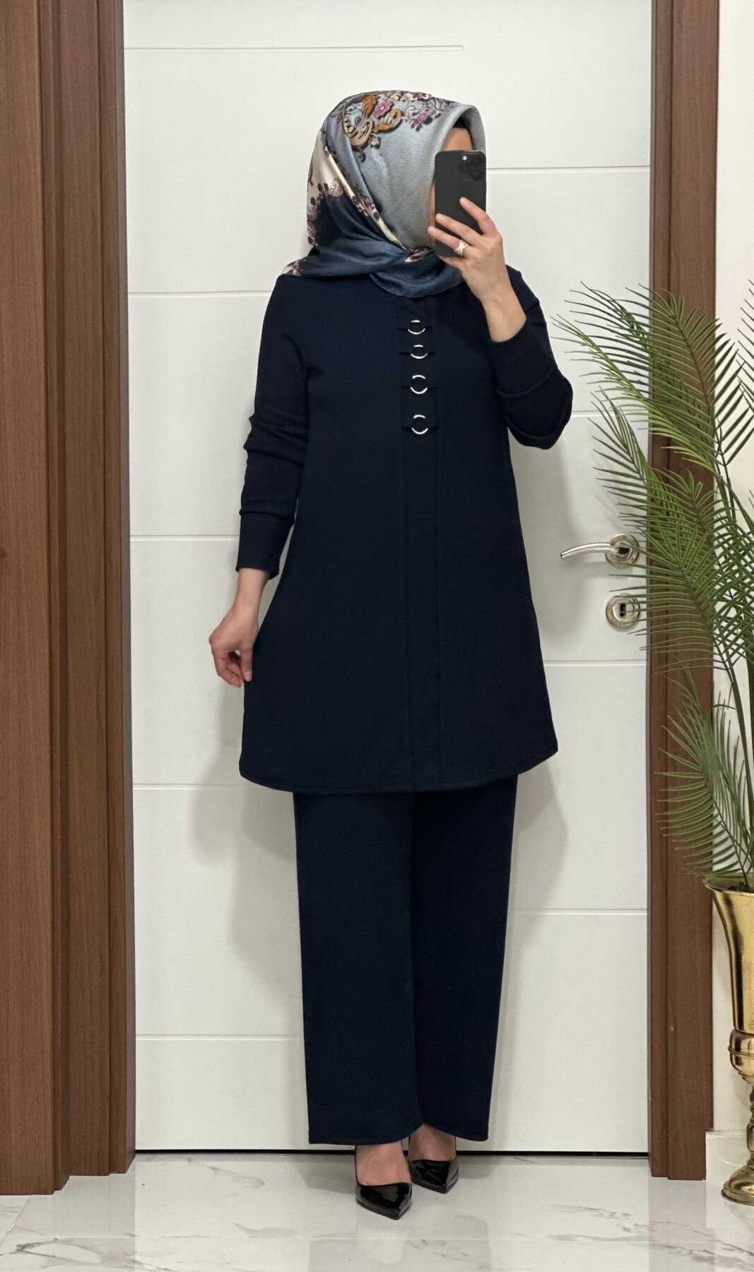 2850 K 90 lacivert fitilli burgu kumaş tunik pantolon takım halka detay buyuk beden yeni sezon