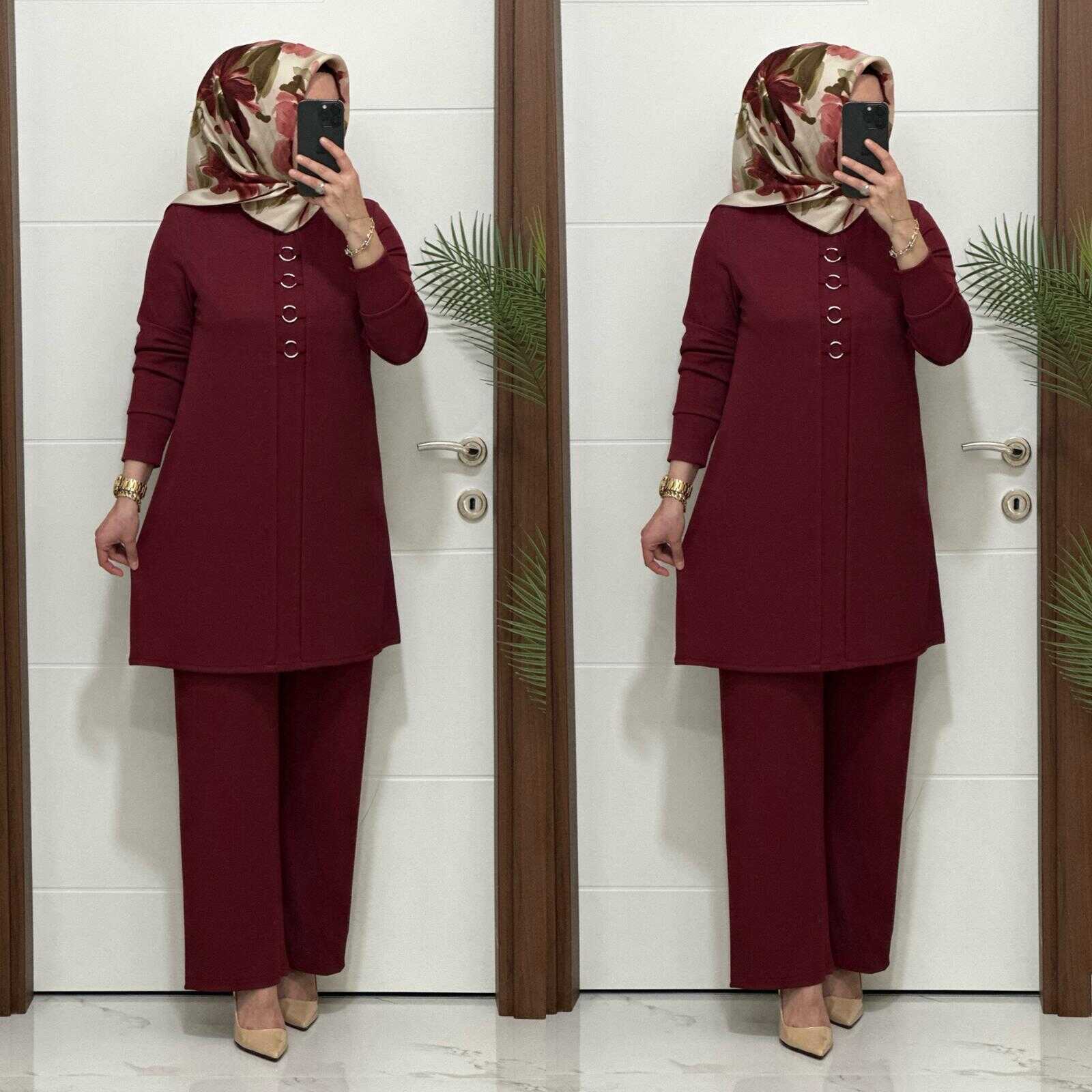 2850 K 90 bordo fitilli burgu kumaş tunik pantolon takım halka detay buyuk beden yeni sezon