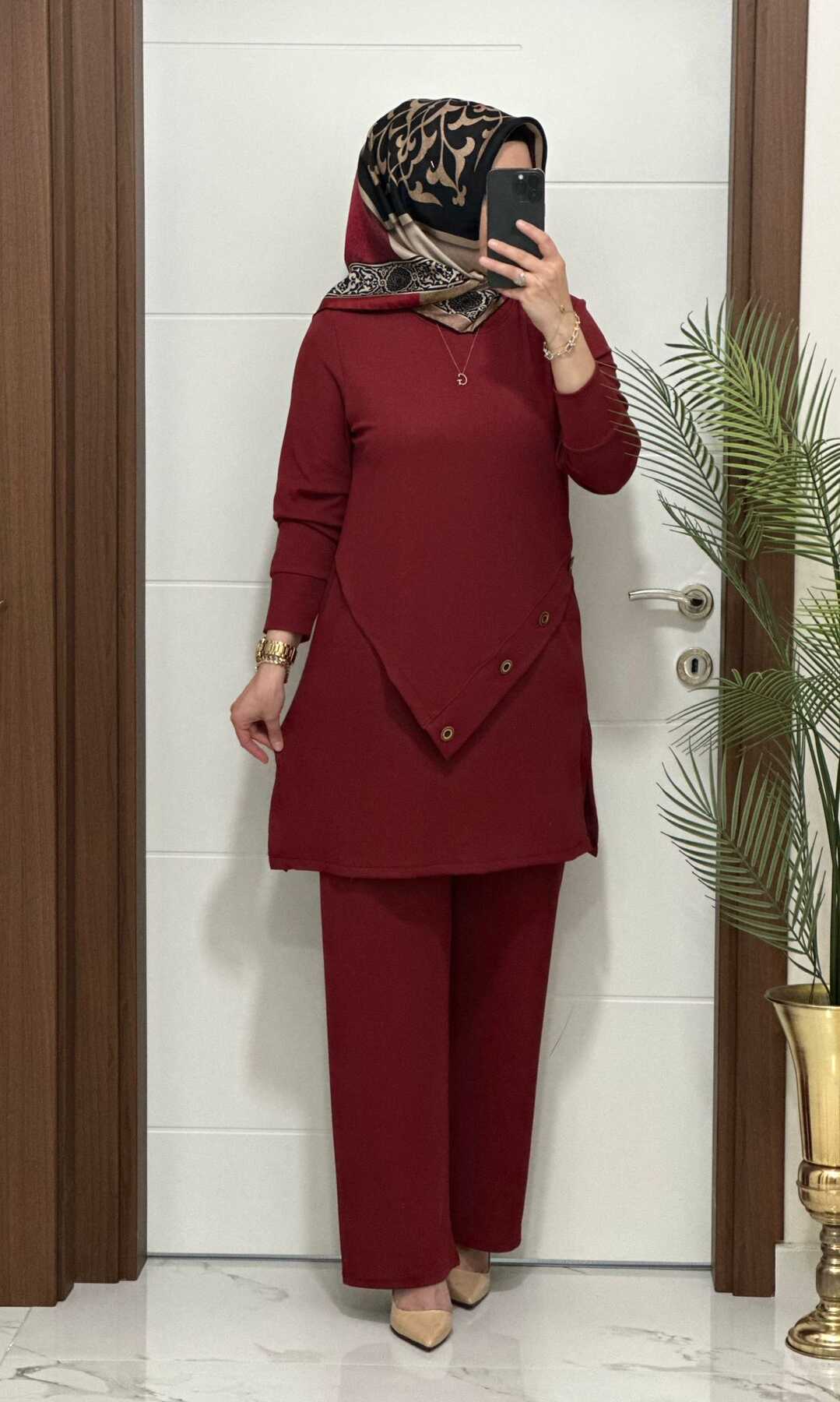 3370 K 90 bordo düğme detay fitilli burgu kumaş tunik pantolon takım buyuk beden yeni sezon