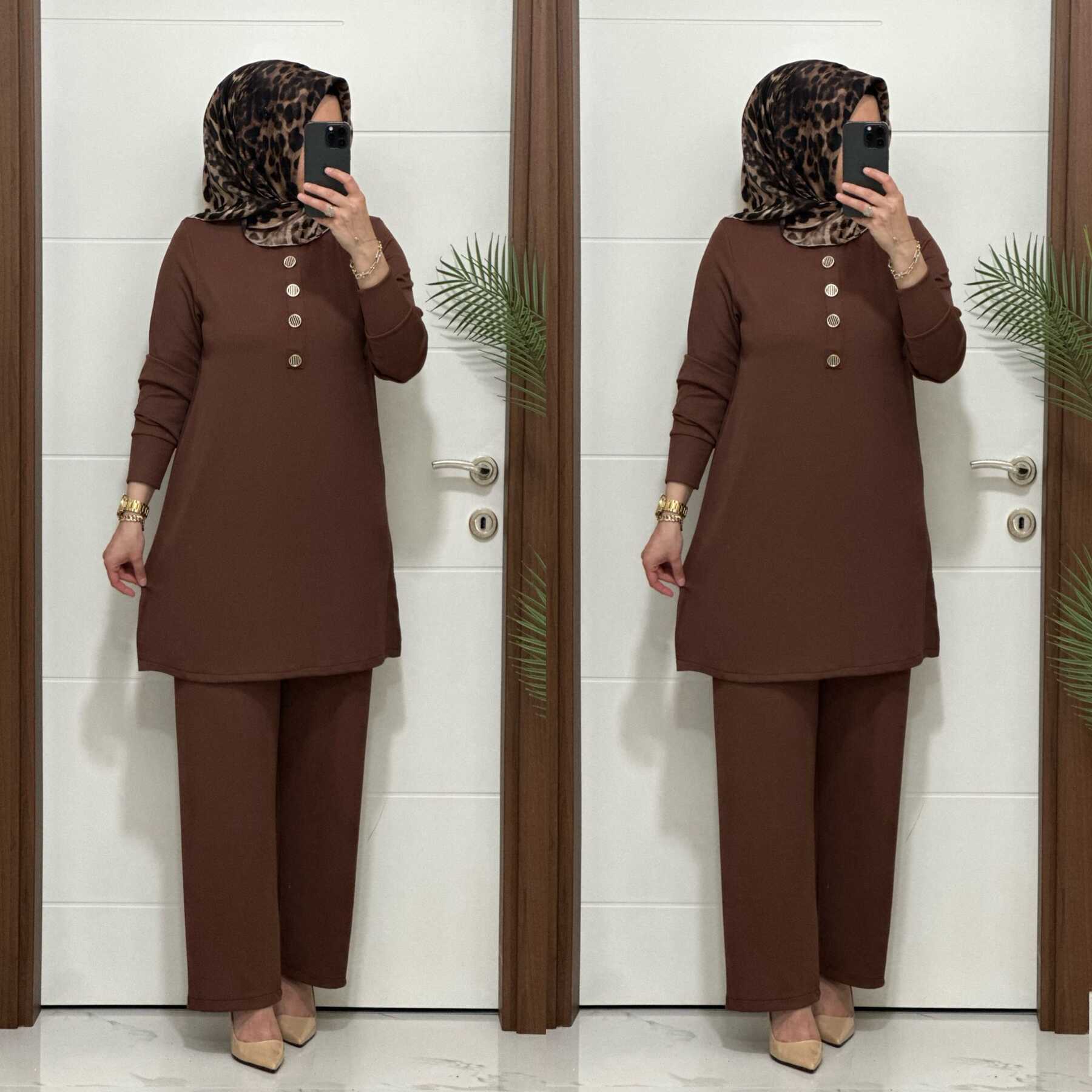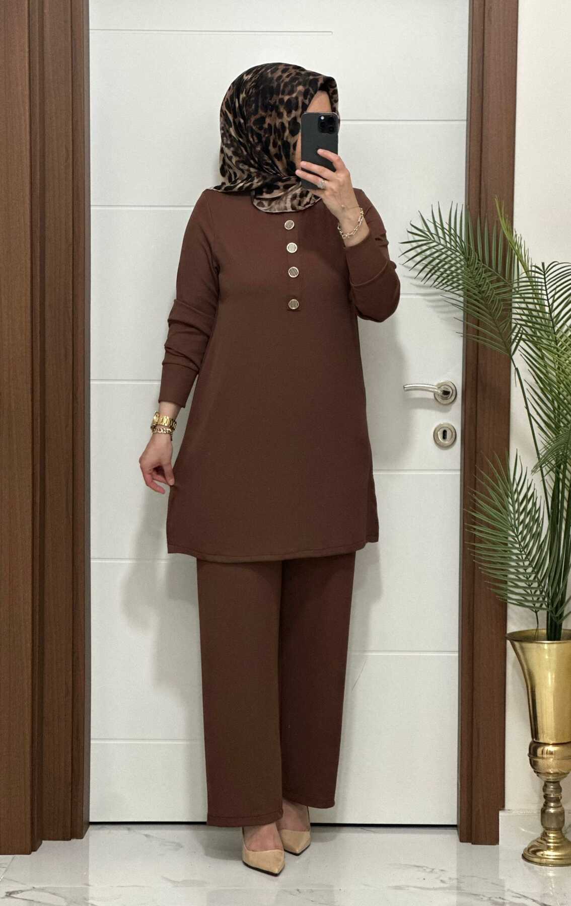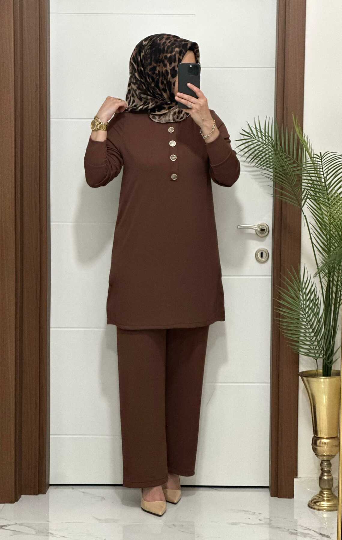 7044 K 90 kahverengi DÜĞMELİ fitilli burgu kumaş tunik pantolon takım buyuk beden yeni sezon