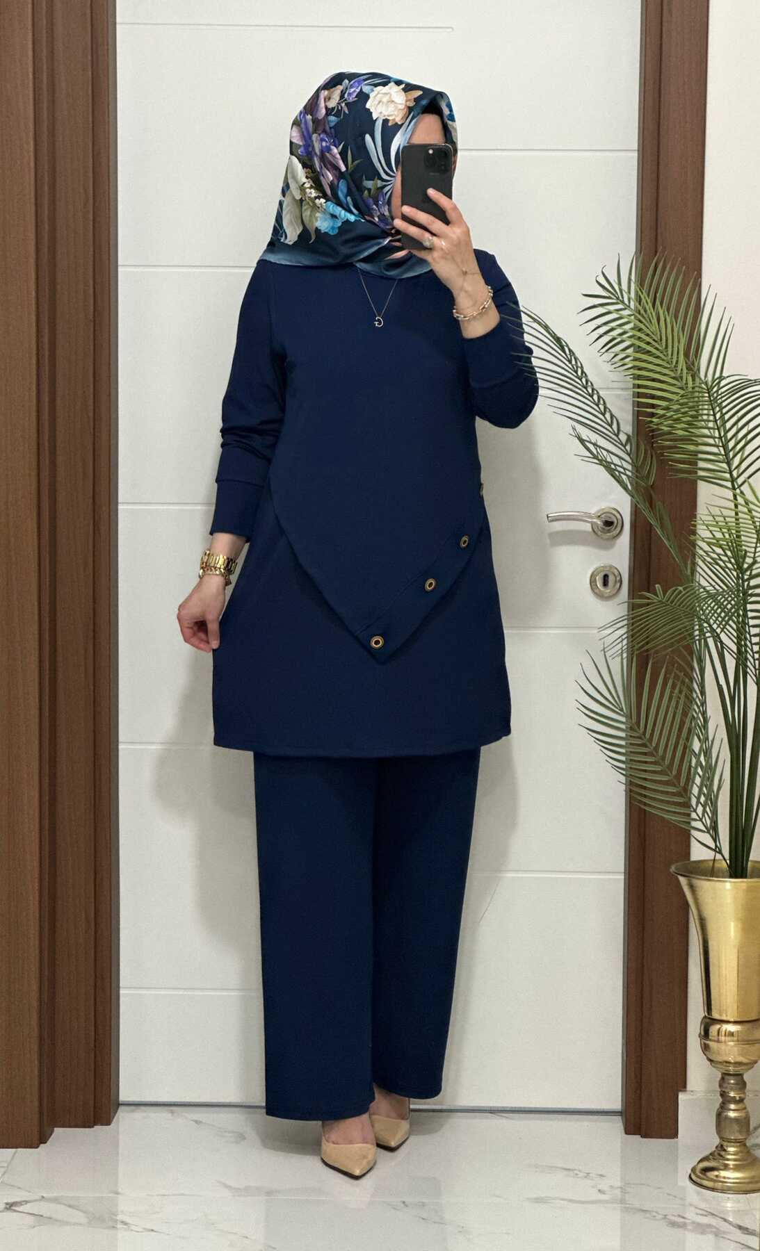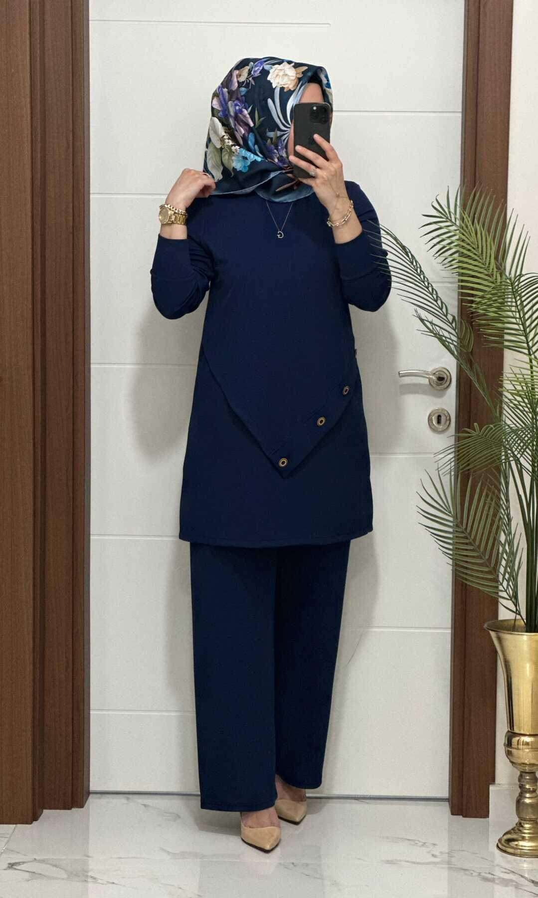 3370 K 90 lacivert düğme detay fitilli burgu kumaş tunik pantolon takım buyuk beden yeni sezon