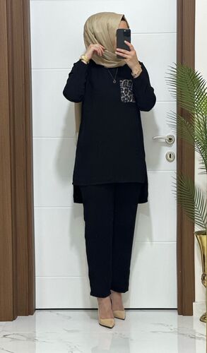 6699 K80 SİYAH LEOPAR CEP DETAYLI tunik pantolon KREP Kumaş ikili takım buyuk beden yeni sezon