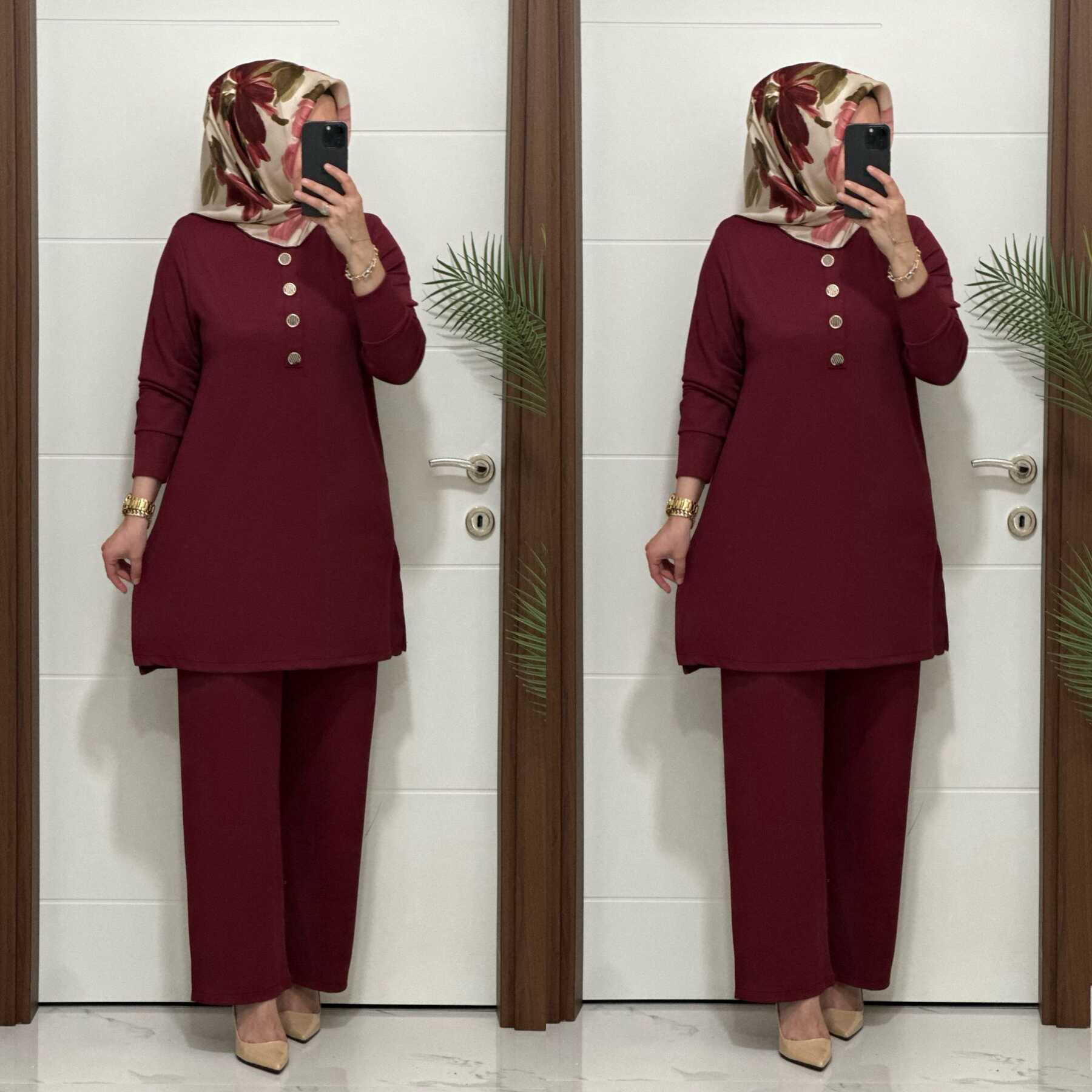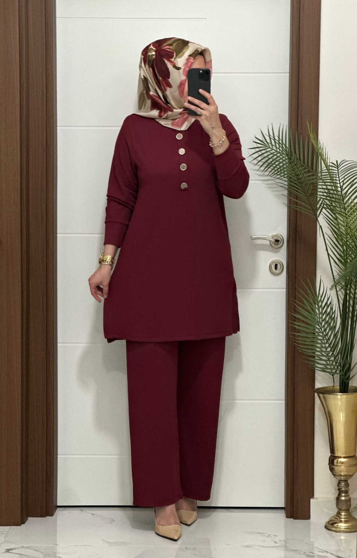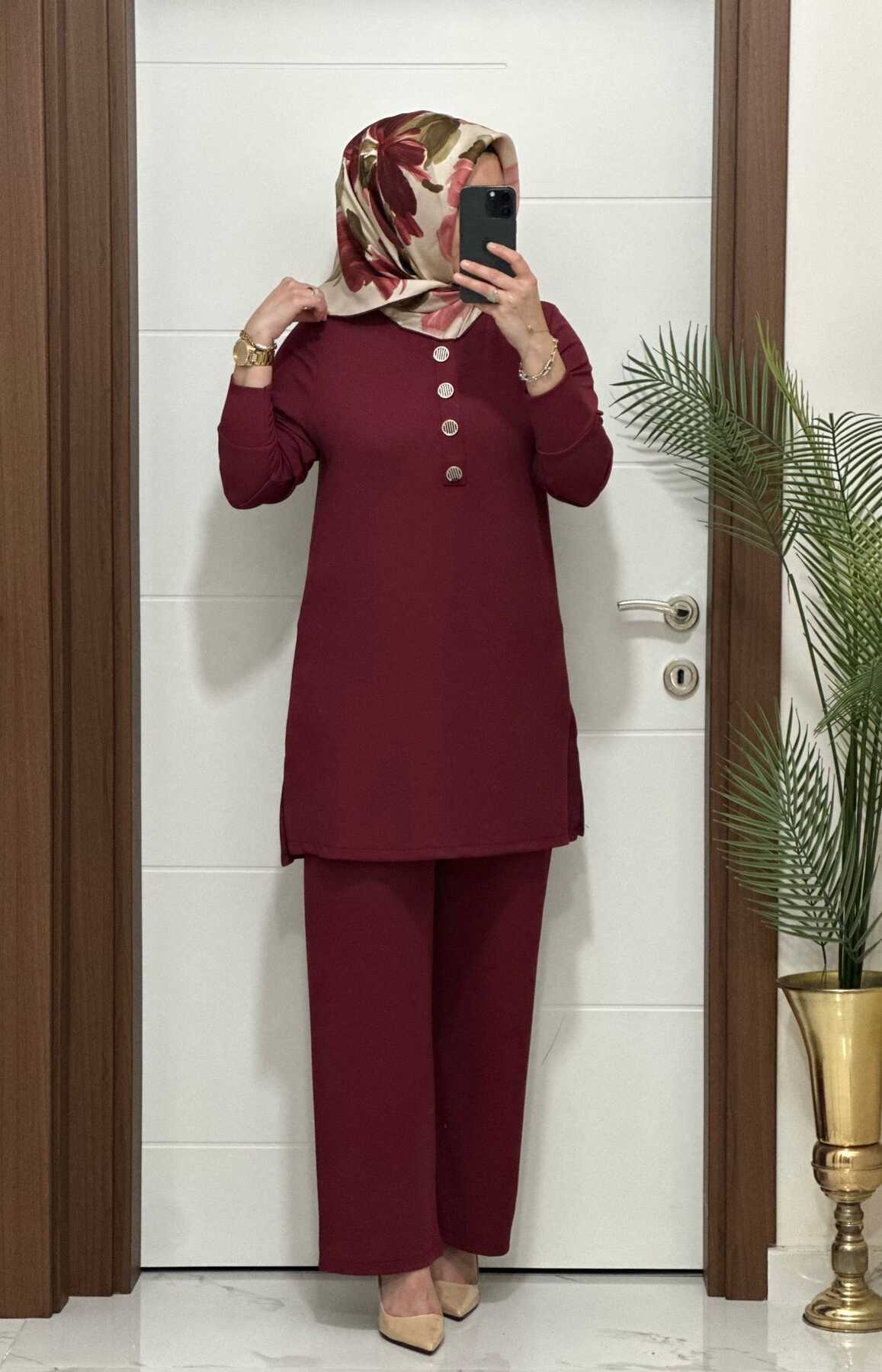7044 K 90 bordo DÜĞMELİ fitilli burgu kumaş tunik pantolon takım buyuk beden yeni sezon