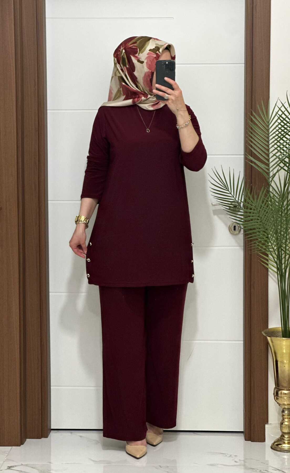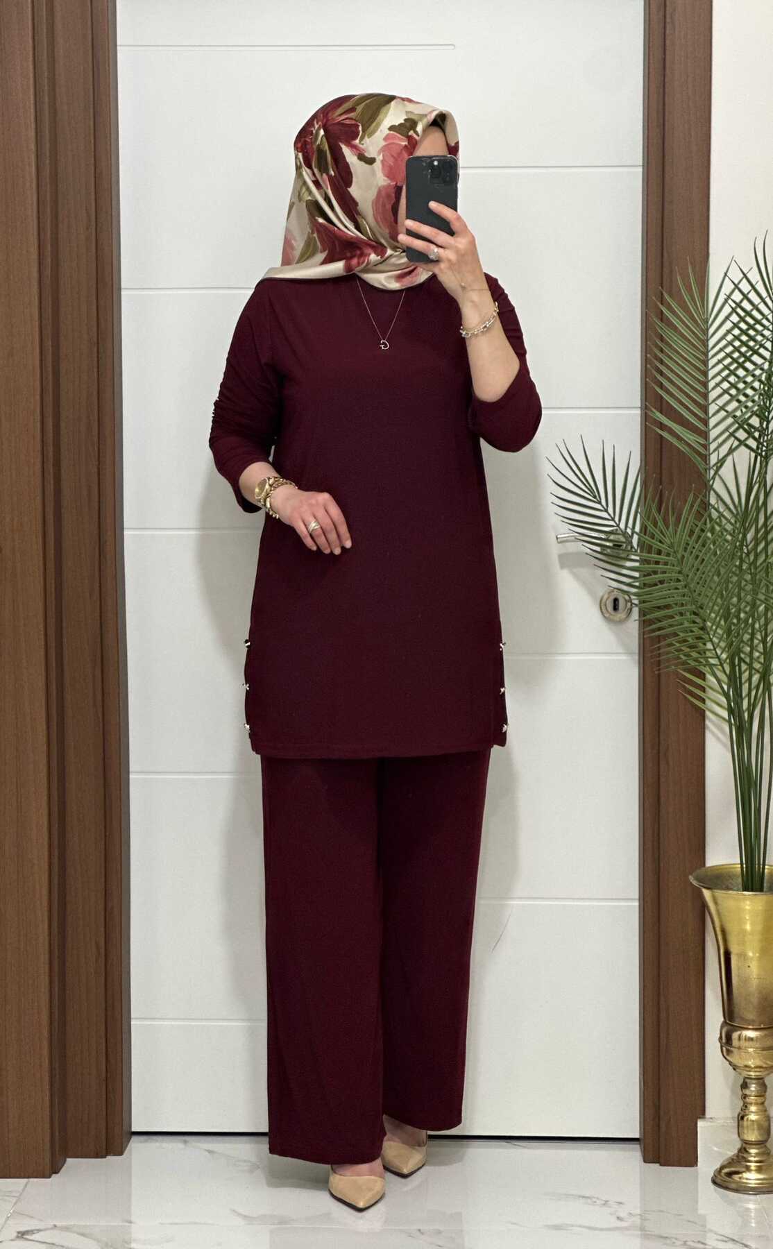 7045 K 110 BORDO sandy kumaş düğmelı TUNİK PANTOLON TAKIM büyük beden yeni sezon