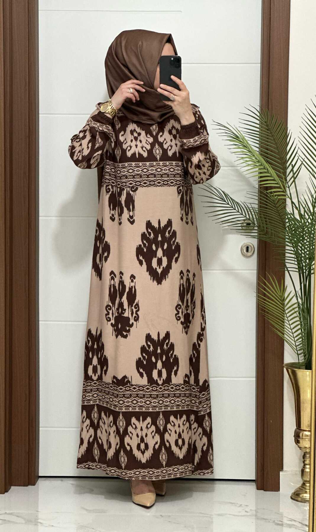 7760 K 70 kahverengi etnik desen viscon kumaş Büyük beden elbise yeni sezon