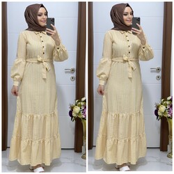 5151 K 70 açık kahverengi fırfır detay elbise okyanus kumaş buyuk beden elbise yeni sezon